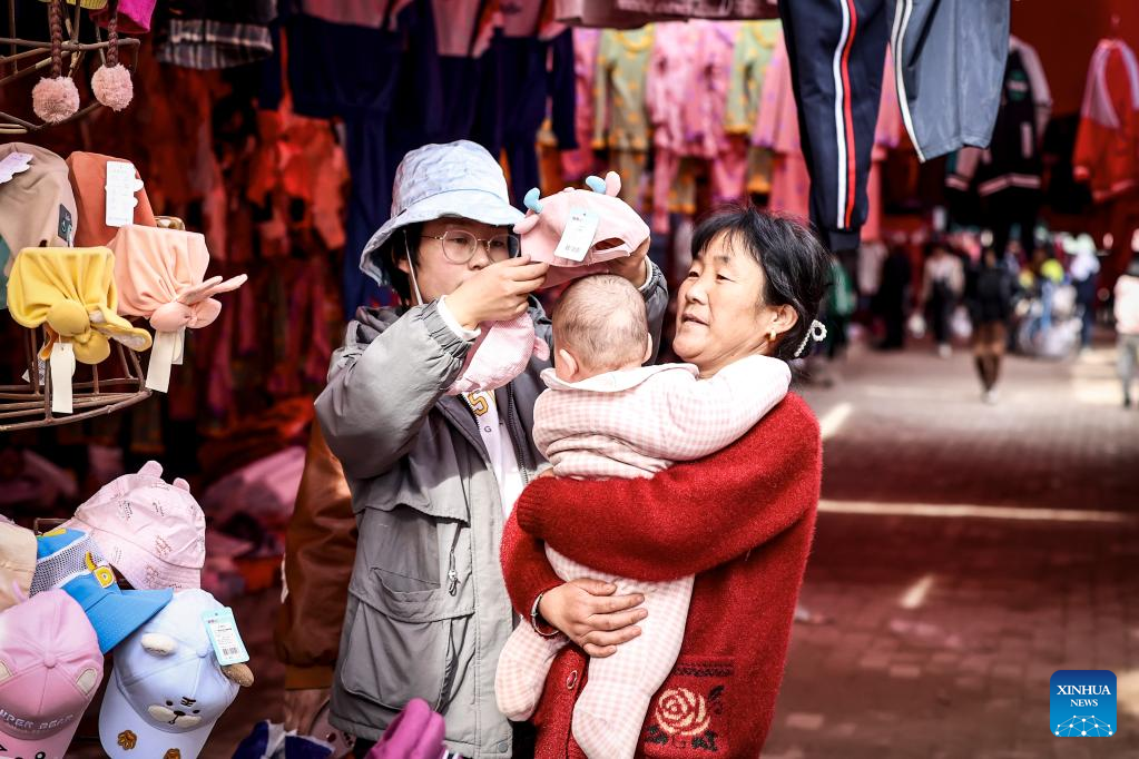 A customer selects hats for her baby at a weekly bazaar in Tokkuzak Township of Shufu County, northwest China's Xinjiang Uygur Autonomous Region, Feb. 26, 2023. (Xinhua/Ma Kai)