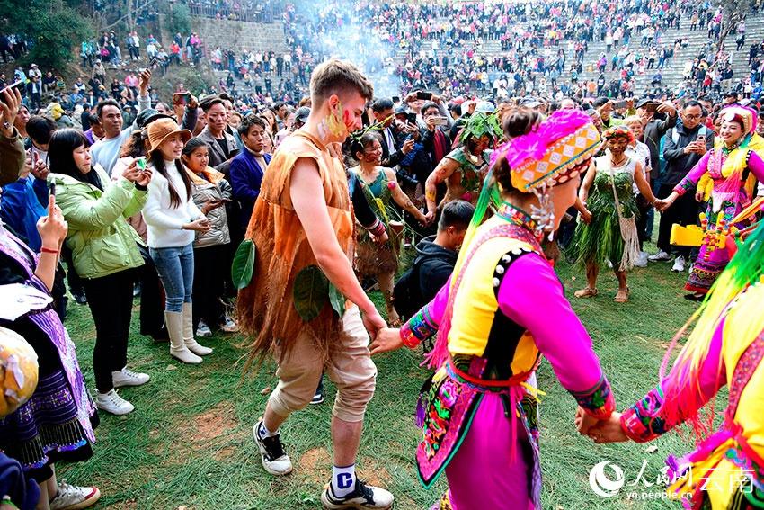A foreign tourist joins in the “Axi Jihuo” festival, in the Hongwan village, Mile city, southwest China's Yunnan Province. (Photo/Pu Jiayong)