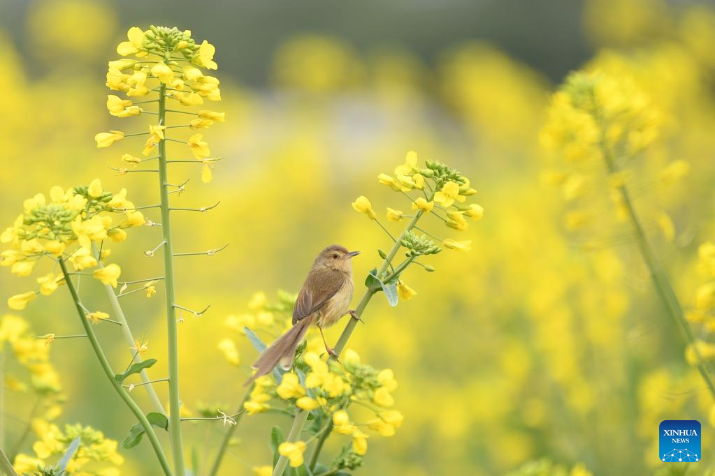 A bird perches on a cole flower sprig in Tuanjie Village of Baini Town, Yuqing County, Zunyi City, southwest China's Guizhou Province, Feb. 28, 2023. (Photo by He Chunyu/Xinhua)