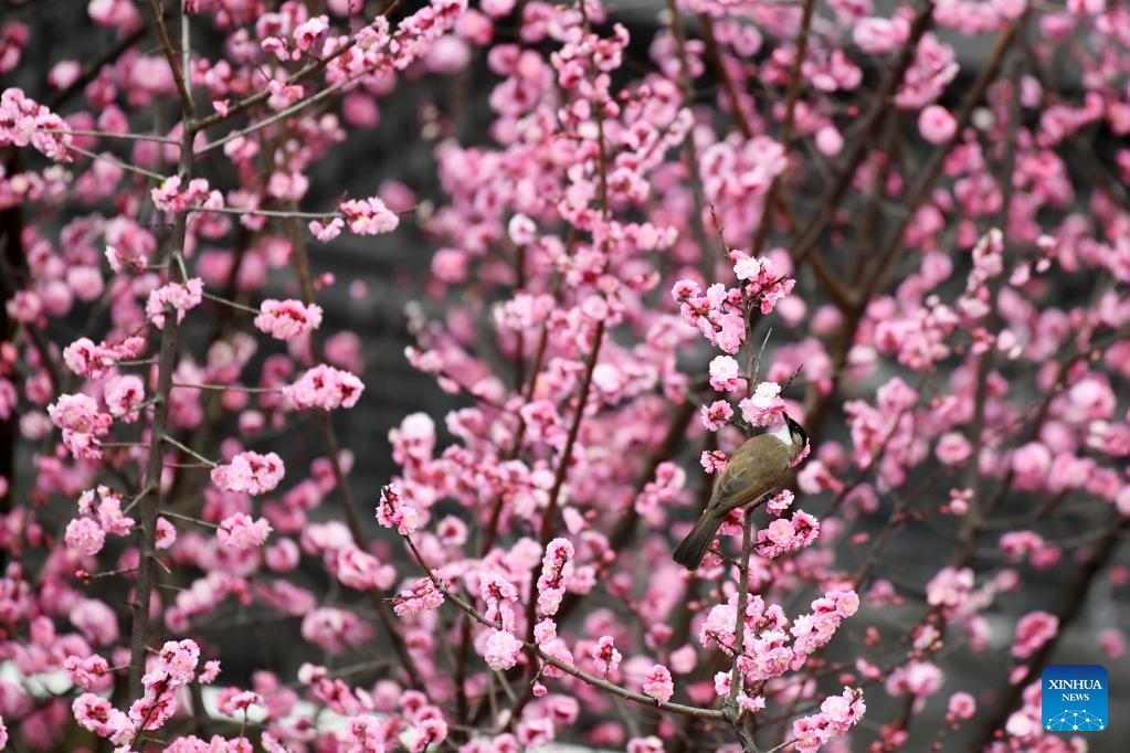 A bird perches on a plum tree branch in Renhuai, southwest China's Guizhou Province, Feb. 27, 2023. (Photo by Chen Yong/Xinhua)