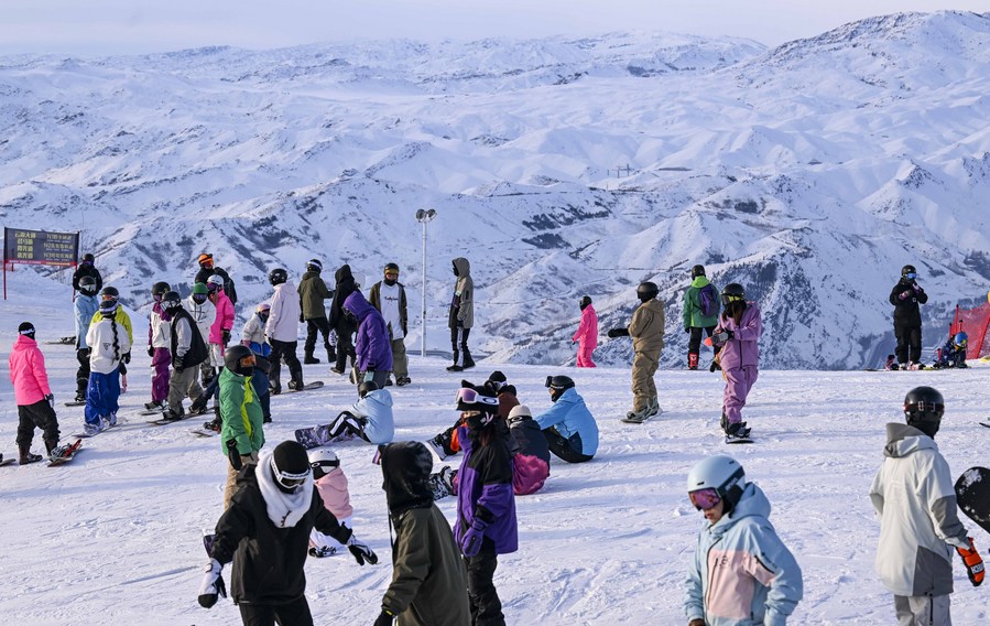 People enjoy themselves at a ski resort in Altay, northwest China's Xinjiang Uygur Autonomous Region on Dec. 30, 2022. (Xinhua/Hu Huhu)