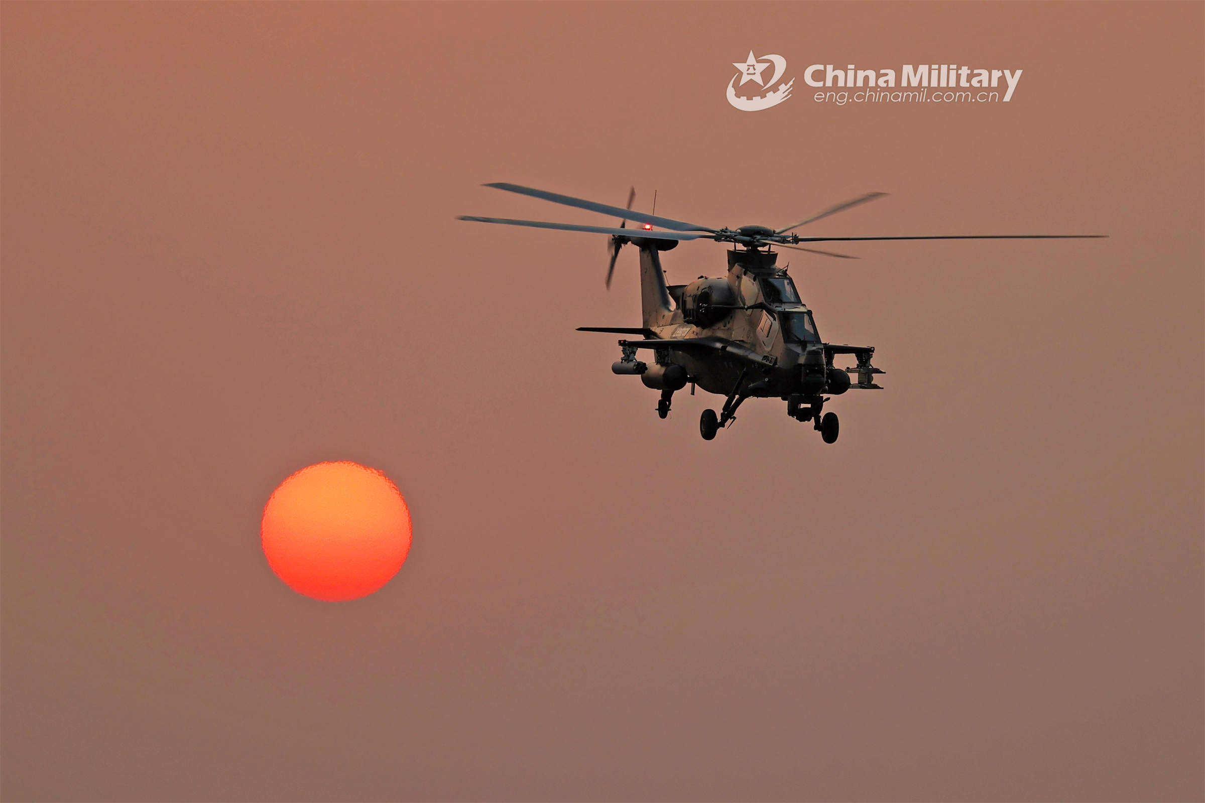 An attack helicopter attached to an army aviation brigadeunder the PLA 72nd Group Army flies at sunset during a round-the-clock flight training exercise in late February, 2023. (eng.chinamil.com.cn/Photo by Zhang Huanpeng)