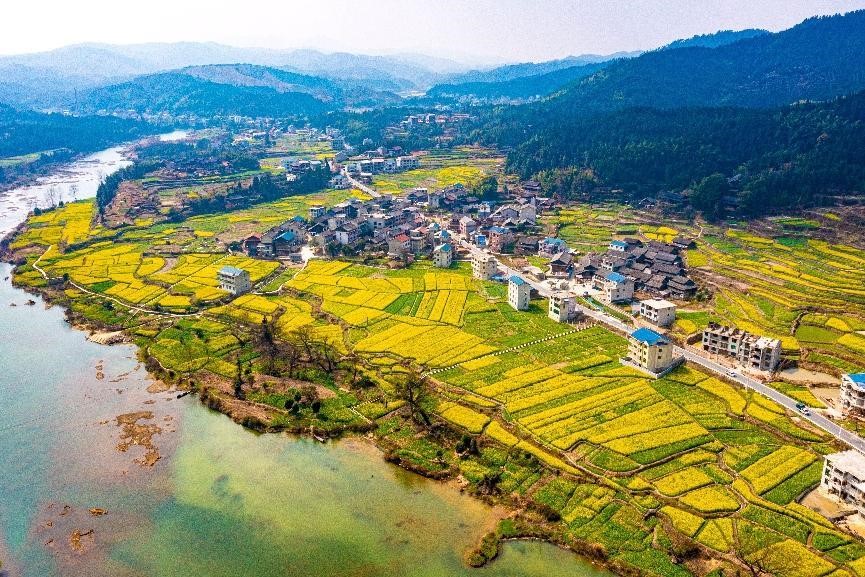 Photo taken on Feb. 26, 2023 shows oilseed rape fields in Tongdao Dong autonomous county, central China's Hunan province. (People's Daily Online/Li Shangyin)