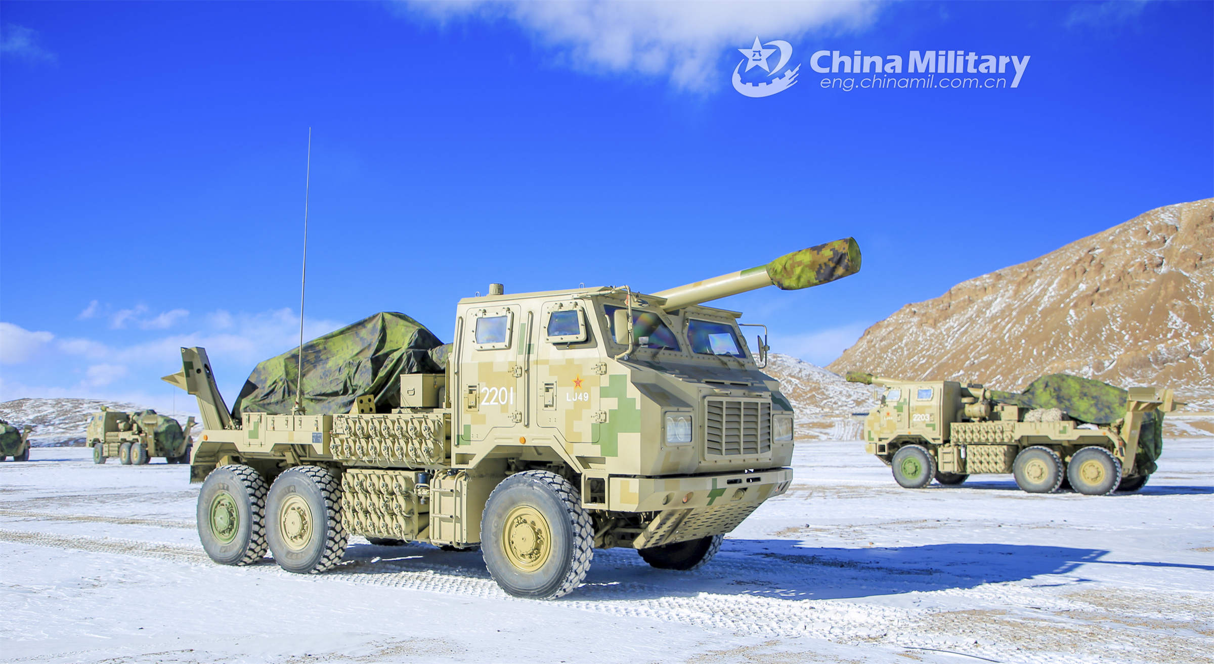Truck-mounted artillery systems attached to a firepower element with a regiment under the PLA Xinjiang Military Command maneuver in speed en route to an assembly area during a tactical maneuver training exercise in mid-February, 2023. (eng.chinamil.com.cn/Photo by Chen Ming)