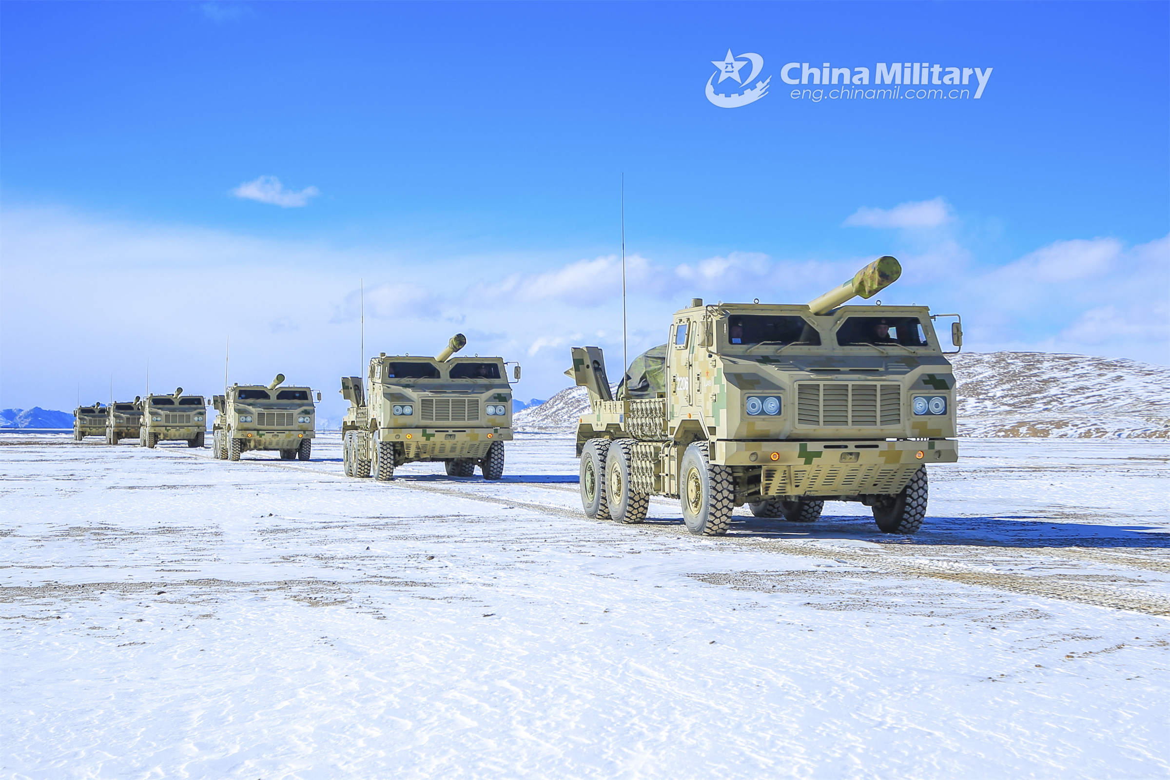 Truck-mounted artillery systems attached to a firepower element with a regiment under the PLA Xinjiang Military Command maneuver in speed en route to an assembly area during a tactical maneuver training exercise in mid-February, 2023. (eng.chinamil.com.cn/Photo by Chen Ming)