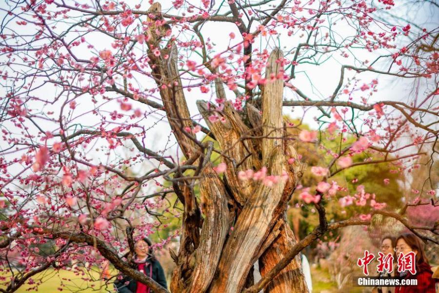 A 600-year-old plum tree is in full blossom, attracting crowds at Xuanwu Lake Park in Nanjing, east China's Jiangsu Province, March 1, 2023. (Photo: China News Service/Yang Bo)