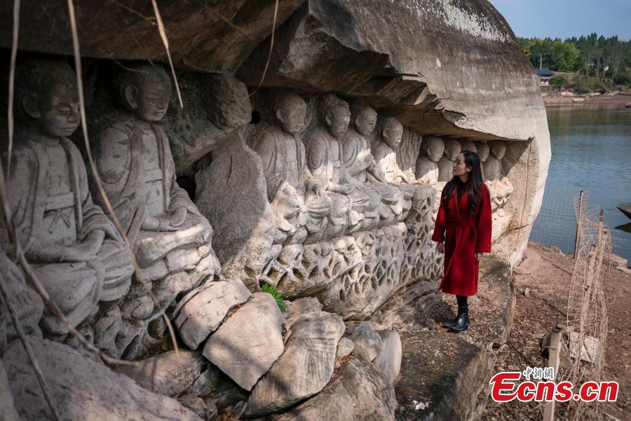 Stone sculptures dating back to Tang (618-907) and Song Dynasty (960-1279) emerge after water level lowers at Anyue County, southwest China's Sichuan Province, March 1, 2023. (Photo: China News Service/Liu Zhongjun)