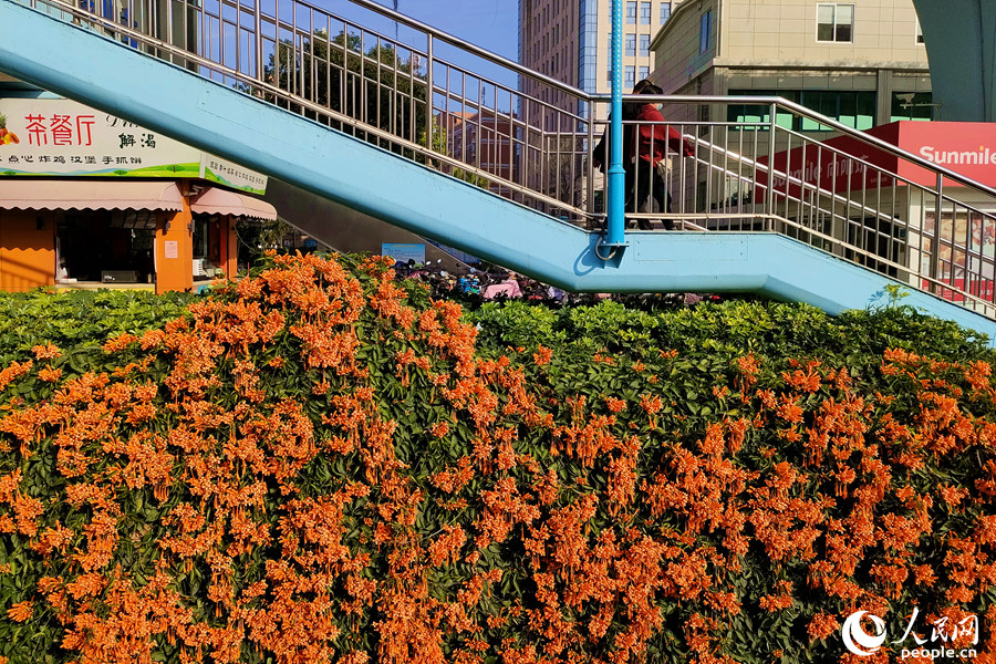 Photo shows blooming orange trumpet vines in Xiamen, southeast China’s Fujian Province. (People’s Daily Online/Chen Bo)