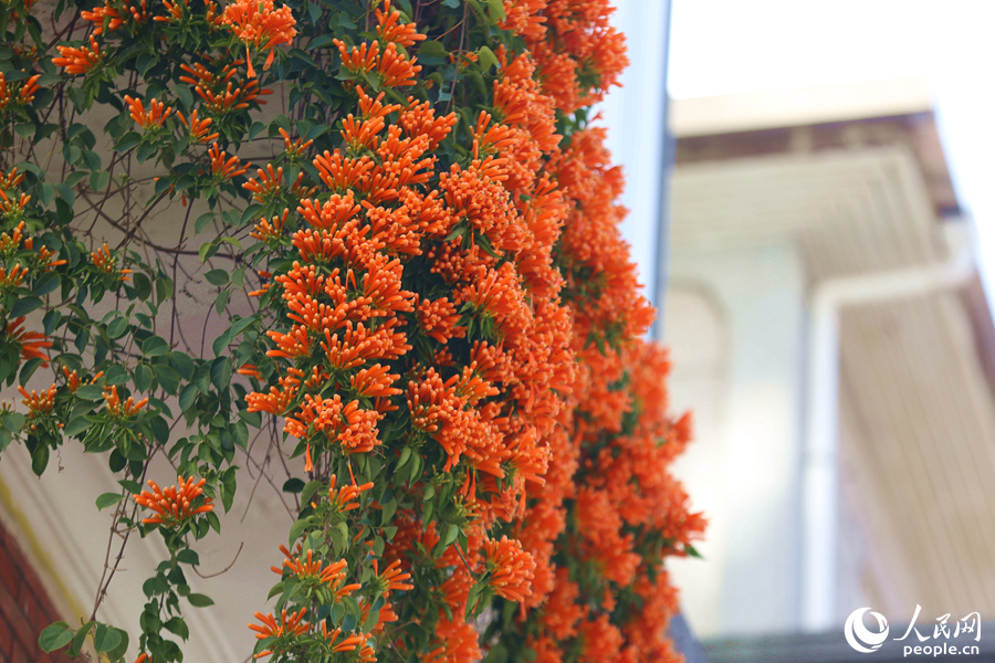 Photo shows blooming orange trumpet vines over an antique arcade in Xiamen, southeast China’s Fujian Province. (People’s Daily Online/Chen Bo)