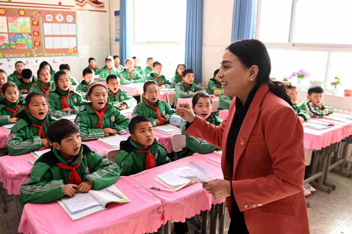 Dong Caiyun, an NPC deputy, holds a course on Feb 23 at Chuimatan Primary School, where she used to work, in Gansu province. [Photo/Xinhua]