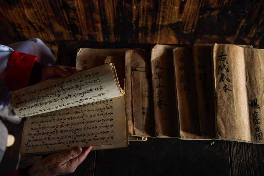 Ancient scripts of Dong Opera are seen in Tianzhu County, southwest China's Guizhou Province, Feb. 26, 2023. (Xinhua/Yang Wenbin)