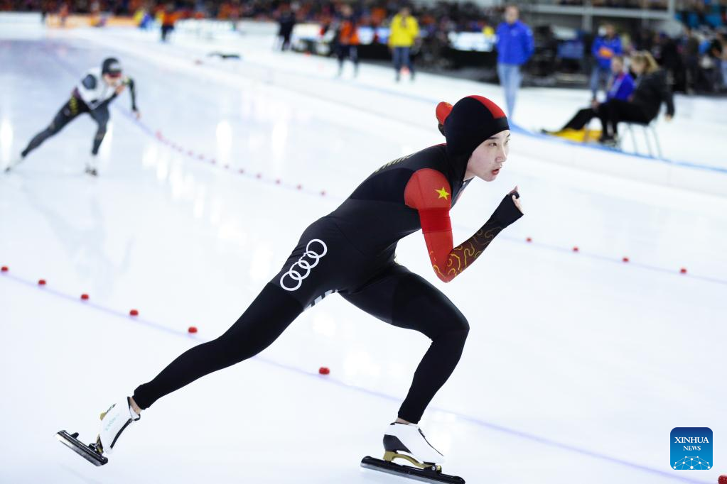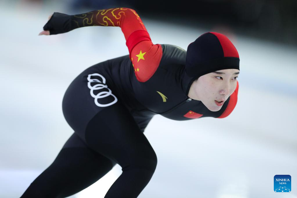 Yang Binyu of China competes during women's 3000m on the Day 1 of the ISU World Speed Skating Championships in Heerenveen, the Netherlands, March 2, 2023. (Xinhua/Zheng Huansong)