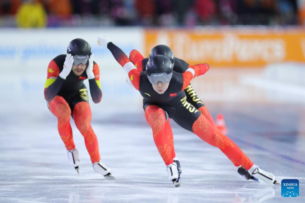 Wang Shiwei (front) of China competes during men's team sprint on the Day 1 of the ISU World Speed Skating Championships in Heerenveen, the Netherlands, March 2, 2023. (Xinhua/Zheng Huansong)