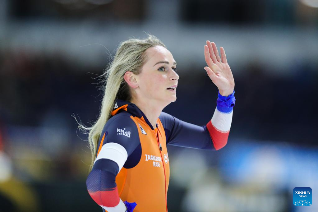 Irene Schouten of the Netherlands reacts during women's 3000m on the Day 1 of the ISU World Speed Skating Championships in Heerenveen, the Netherlands, March 2, 2023. (Xinhua/Zheng Huansong)