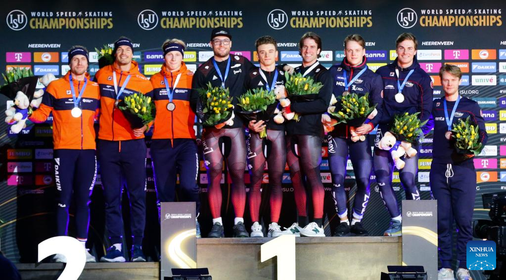 Gold medalist team Canada, sivler medalist team the Netherlands and bronze medalist team Norway pose for photos during the awarding ceremony after men's team sprint on the Day 1 of the ISU World Speed Skating Championships in Heerenveen, the Netherlands, March 2, 2023. (Xinhua/Zheng Huansong)