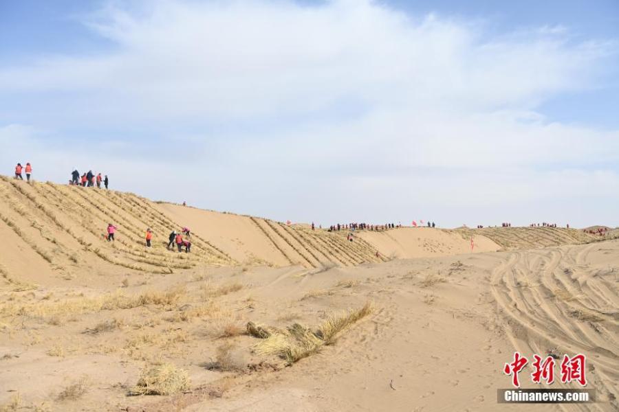 Locals make straw checkerboard sand barriers to combat desertification in Wuwei, northwest China's Gansu Province, March 2, 2023. Gansu has taken effective measures in fighting against desertification. (Photo/China News Service)