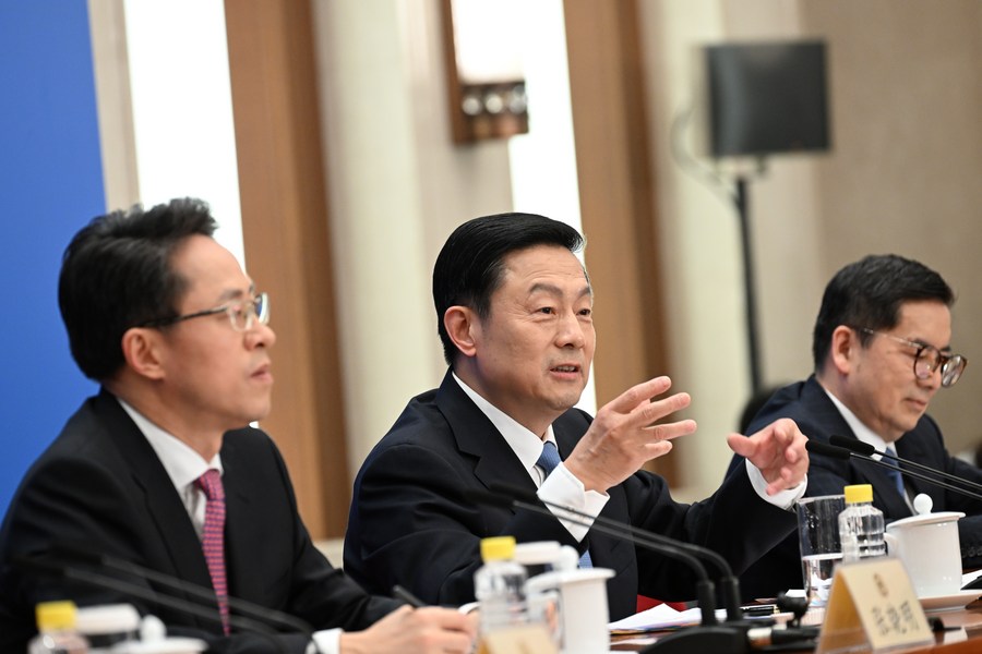 Guo Weimin (C), spokesperson for the first session of the 14th National Committee of the Chinese People's Political Consultative Conference (CPPCC), attends a press conference at the Great Hall of the People in Beijing, capital of China, March 3, 2023. The CPPCC National Committee held a press conference on Friday, one day ahead of the top political advisory body's annual session. (Xinhua/Jin Liangkuai)