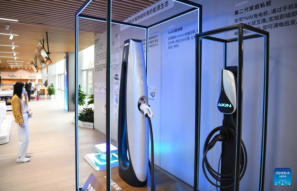 This photo taken on Feb. 24, 2023 shows the charging piles displayed at GAC Aion, an NEV subsidiary of Guangzhou Automobile Group Co., Ltd. (GAC Group), in Guangzhou, south China's Guangdong Province. Guangzhou, one of China's major car manufacturing bases, has been striving to attract investment in NEV industry in recent years. (Xinhua/Deng Hua)