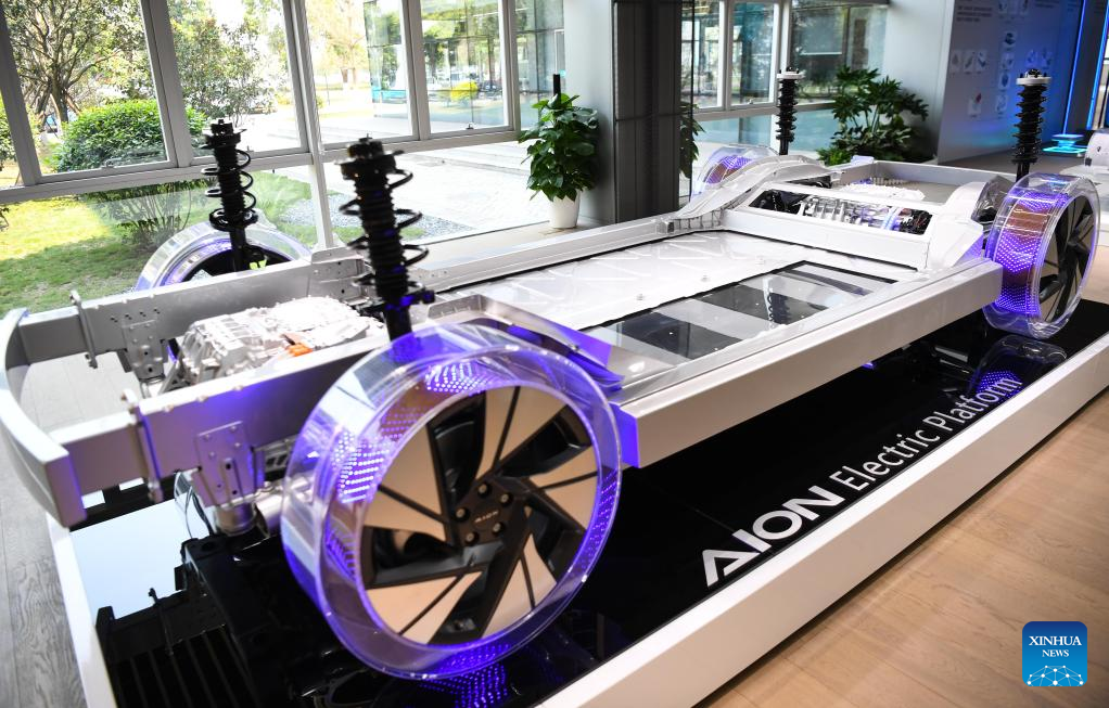 This photo taken on Feb. 24, 2023 shows an electric platform at GAC Aion, an NEV subsidiary of Guangzhou Automobile Group Co., Ltd. (GAC Group), in Guangzhou, south China's Guangdong Province. Guangzhou, one of China's major car manufacturing bases, has been striving to attract investment in NEV industry in recent years. (Xinhua/Deng Hua)