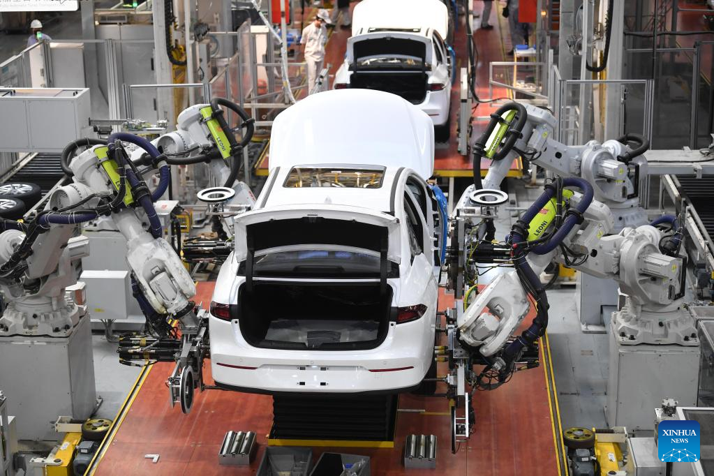 This photo taken on Feb. 24, 2023 shows the assembly line of GAC Aion, an NEV subsidiary of Guangzhou Automobile Group Co., Ltd. (GAC Group), in Guangzhou, south China's Guangdong Province. Guangzhou, one of China's major car manufacturing bases, has been striving to attract investment in NEV industry in recent years. (Xinhua/Deng Hua)