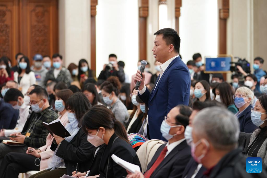 A journalist with Xinhua News Agency asks questions during a press conference ahead of the first session of the 14th National People's Congress (NPC) at the Great Hall of the People in Beijing, capital of China, March 4, 2023. The NPC, China's national legislature, held a press conference Saturday, one day before the opening of its annual session. (Xinhua/Xing Guangli)