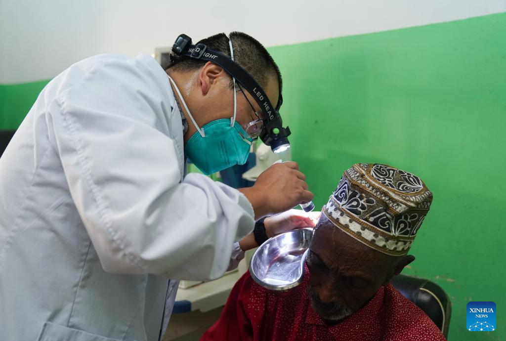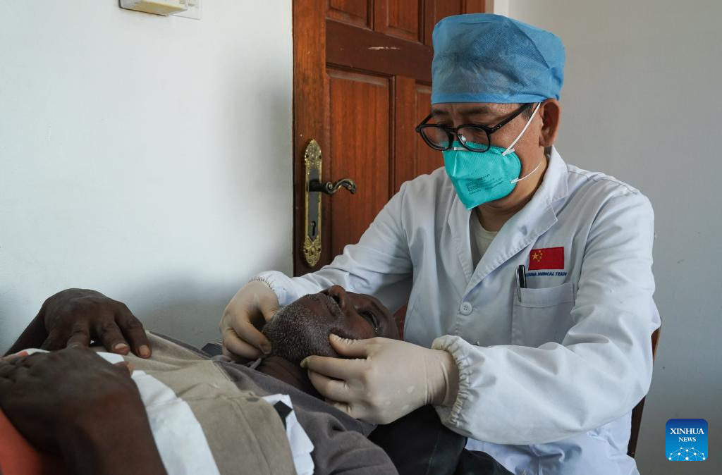 Lian Xingang, a member of the 21st Chinese medical team dispatched to Djibouti, provides medical treatments for a patient at the Peltier General Hospital in Djibouti City, Djibouti, Feb. 28, 2023. The 21st Chinese medical team dispatched to Djibouti has been providing medical services at the Peltier General Hospital since January 2022. By the end of February 2023, the medical team had provided 14,658 outpatient services, 576 emergency services and completed 1,168 surgeries. (Xinhua/Han Xu)