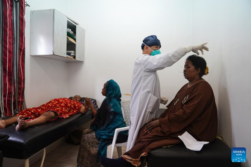 Zhou Naizhong, a member of the 21st Chinese medical team dispatched to Djibouti, provides acupuncture treatments for patients at the Peltier General Hospital in Djibouti City, Djibouti, Feb. 28, 2023. The 21st Chinese medical team dispatched to Djibouti has been providing medical services at the Peltier General Hospital since January 2022. By the end of February 2023, the medical team had provided 14,658 outpatient services, 576 emergency services and completed 1,168 surgeries. (Xinhua/Han Xu)