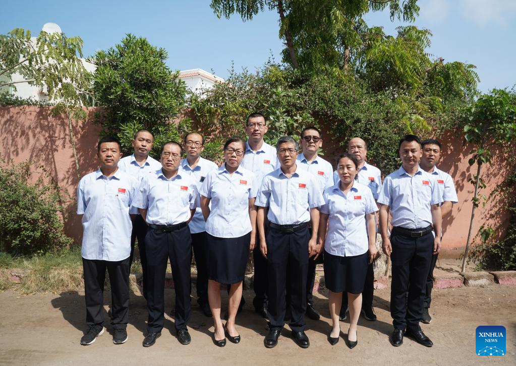 Members of the 21st Chinese medical team dispatched to Djibouti pose for a group photo in Djibouti City, Djibouti, March 1, 2023. The 21st Chinese medical team dispatched to Djibouti has been providing medical services at the Peltier General Hospital since January 2022. By the end of February 2023, the medical team had provided 14,658 outpatient services, 576 emergency services and completed 1,168 surgeries. (Xinhua/Han Xu)