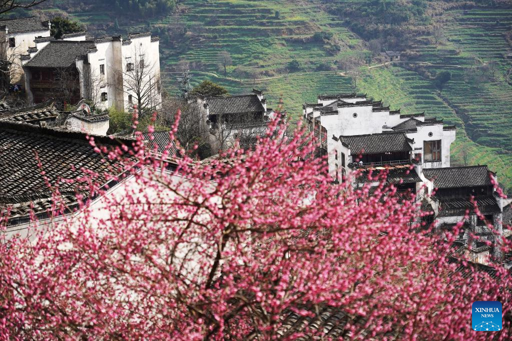 People enjoy flowers at a scenic spot in Wuyuan County of east China's Jiangxi Province, March 3, 2023. Spring scenery in Wuyuan attracts lots of visitors with the rising of temperature. (Xinhua/Wan Xiang)