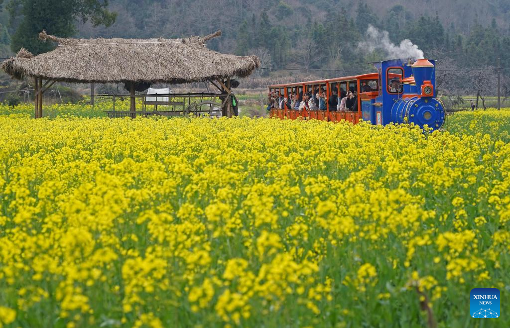People take a sightseeing train at a scenic spot in Wuyuan County of east China's Jiangxi Province, March 3, 2023. Spring scenery in Wuyuan attracts lots of visitors with the rising of temperature. (Xinhua/Wan Xiang)