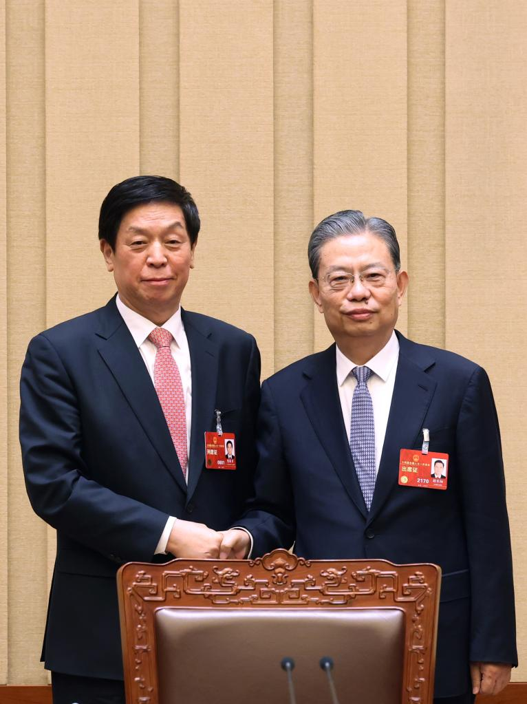 Li Zhanshu shakes hands with Zhao Leji at the first meeting of the presidium of the first session of the 14th National People's Congress (NPC) at the Great Hall of the People in Beijing, capital of China, March 4, 2023. (Xinhua/Huang Jingwen)