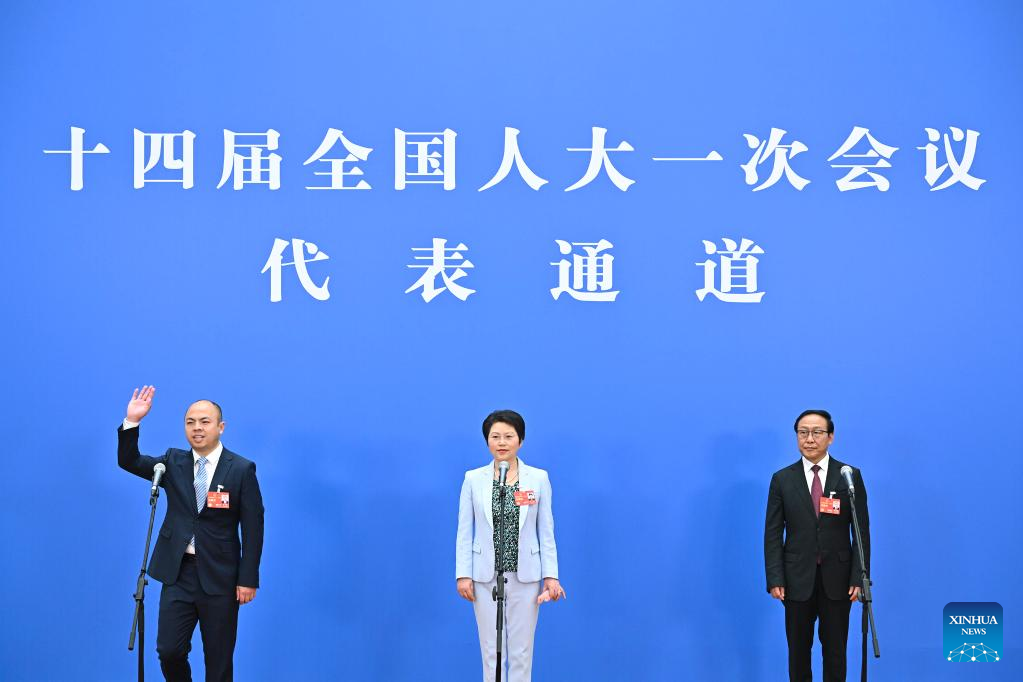 Deputies to the 14th National People's Congress (NPC) are interviewed ahead of the opening meeting of the first session of the 14th NPC in Beijing, capital of China, March 5, 2023. (Xinhua/Liu Jinhai)