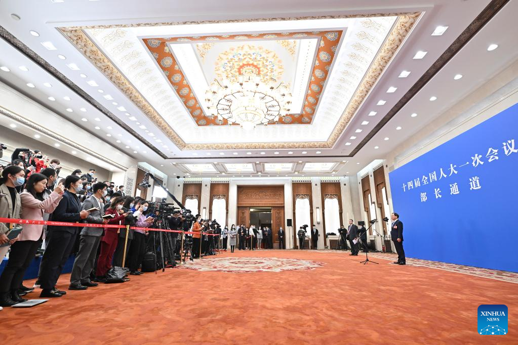 Minister of Science and Technology Wang Zhigang gives an interview after the opening meeting of the first session of the 14th National People's Congress (NPC) in Beijing, capital of China, March 5, 2023. (Xinhua/Liu Jinhai)