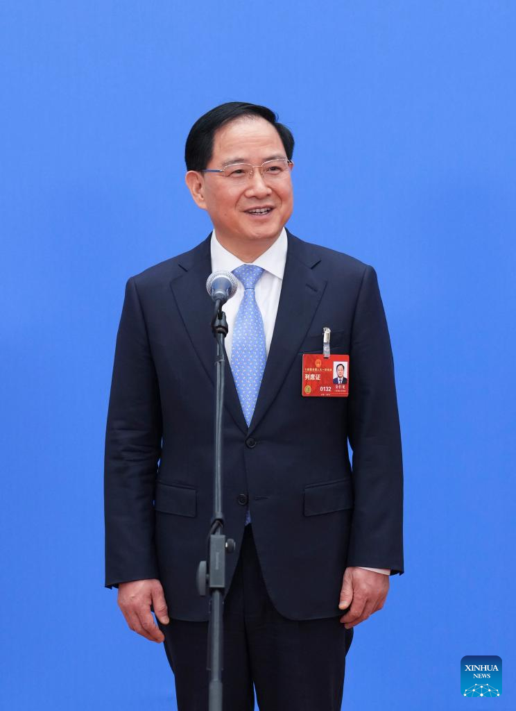Minister of Ecology and Environment Huang Runqiu gives an interview after the opening meeting of the first session of the 14th National People's Congress (NPC) in Beijing, capital of China, March 5, 2023. (Xinhua/Liu Jinhai)