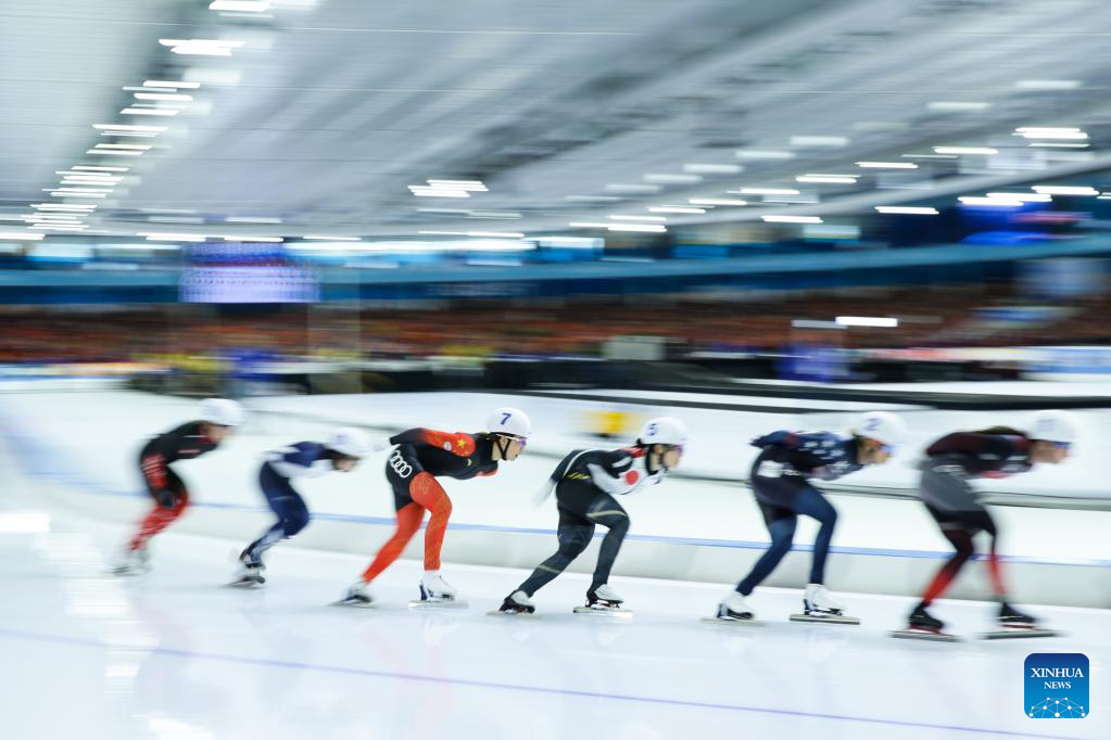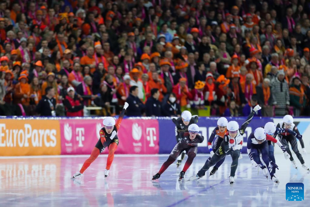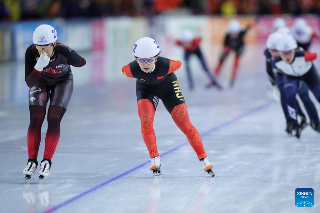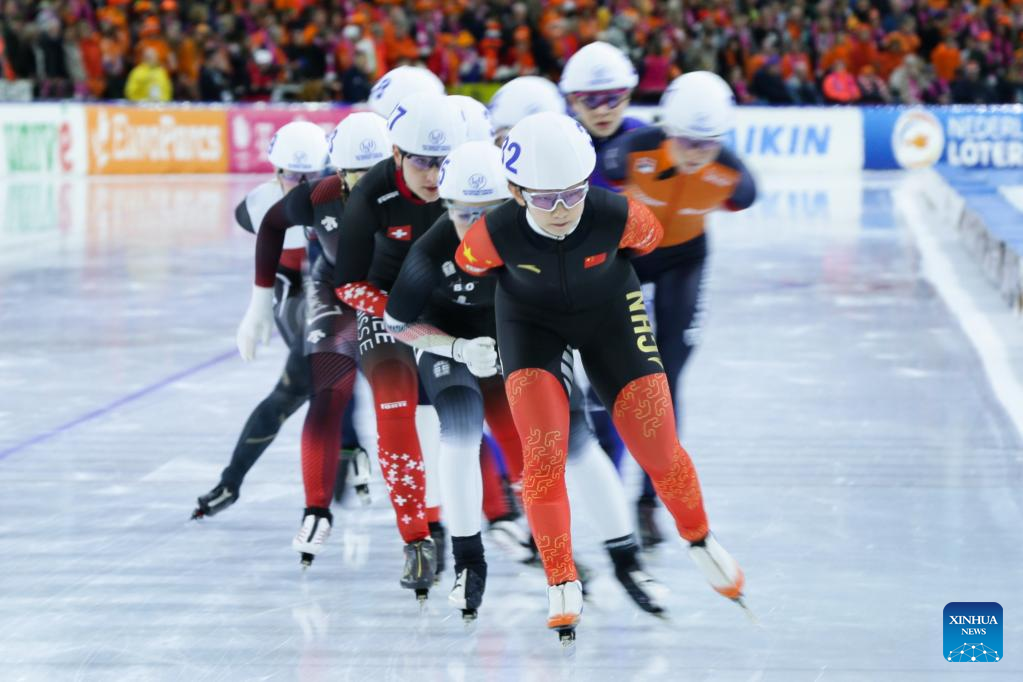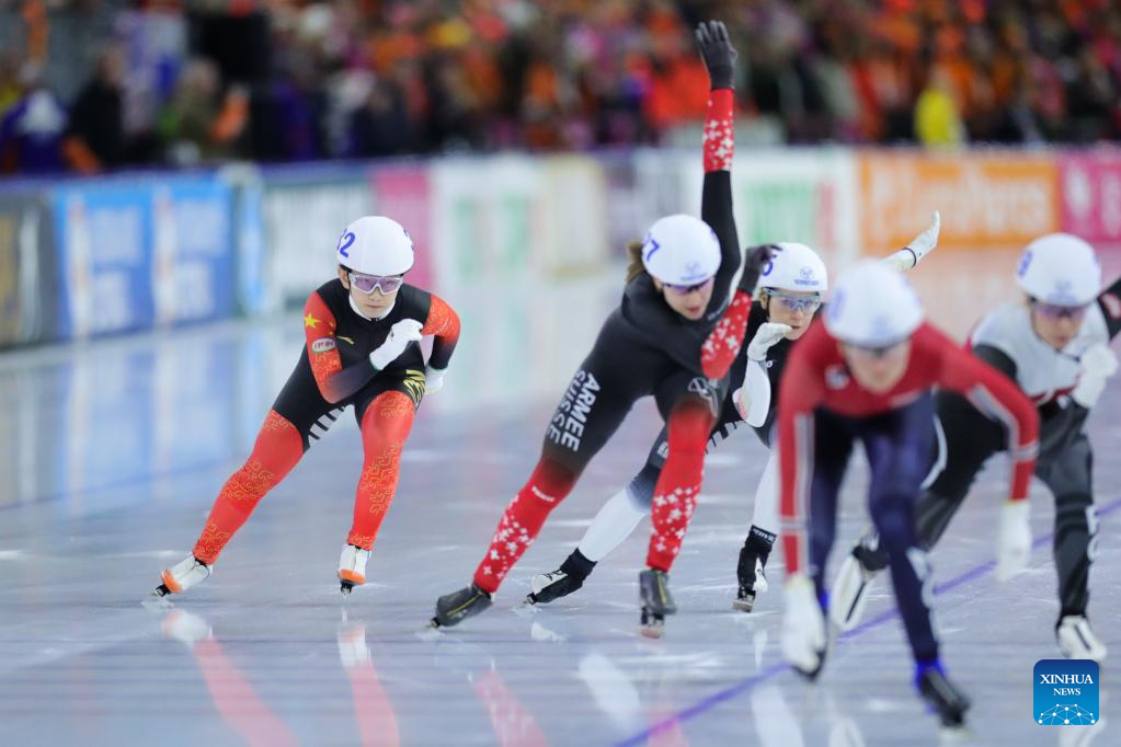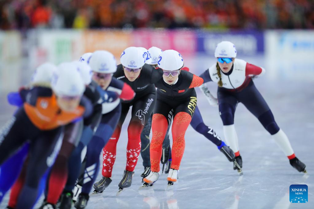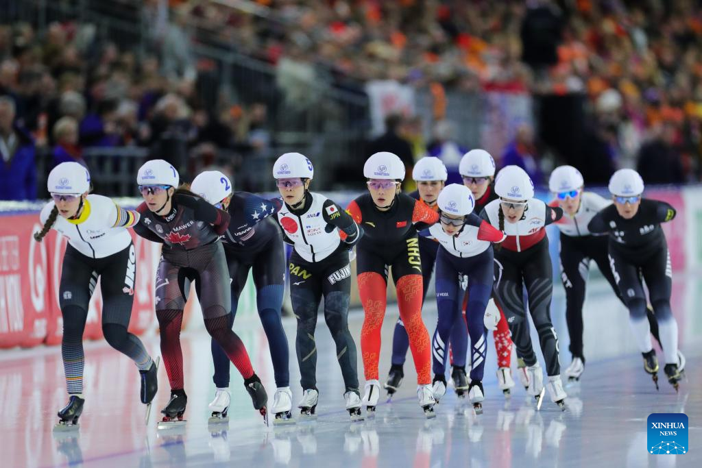 Yang Binyu (1st L) of China competes during the women's mass start semifinal at the ISU World Speed Skating Championships in Heerenveen, the Netherlands, March 4, 2023. (Xinhua/Zheng Huansong)