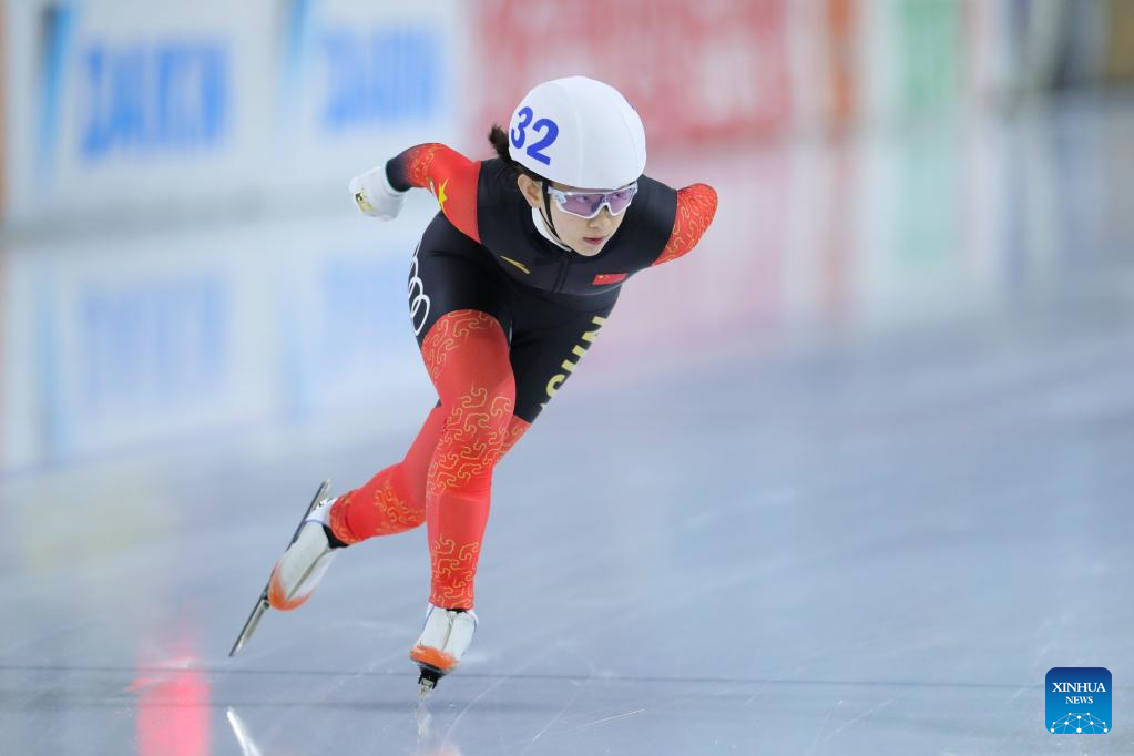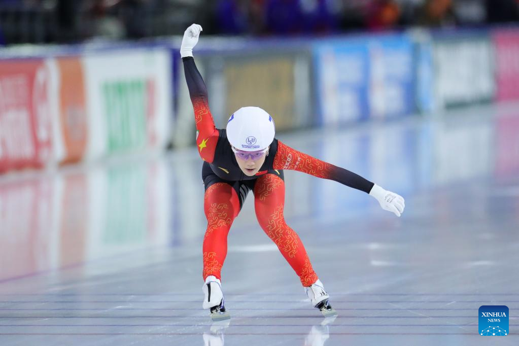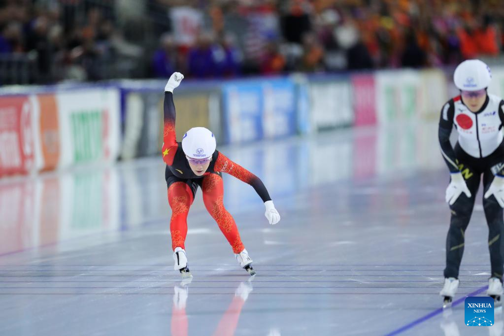 Yang Binyu of China competes during the women's mass start semifinal at the ISU World Speed Skating Championships in Heerenveen, the Netherlands, March 4, 2023. (Xinhua/Zheng Huansong)