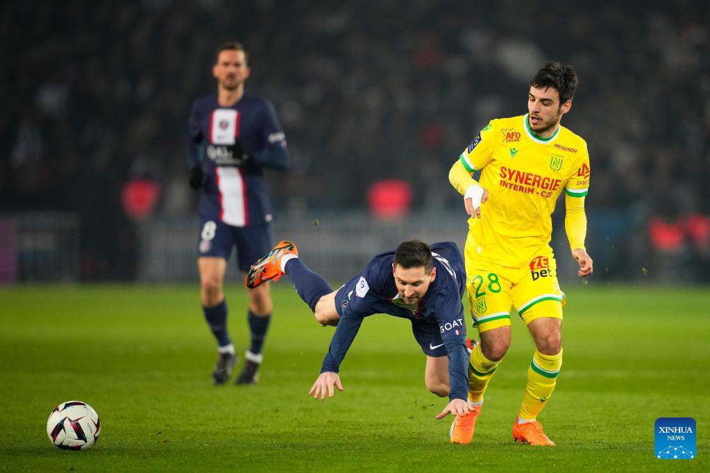 Paris Saint Germain's Lionel Messi (front, L) competes during a French Ligue 1 football match between Paris Saint Germain (PSG) and Nantes FC in Paris, France, March 4, 2023. (Photo by Glenn Gervot/Xinhua)