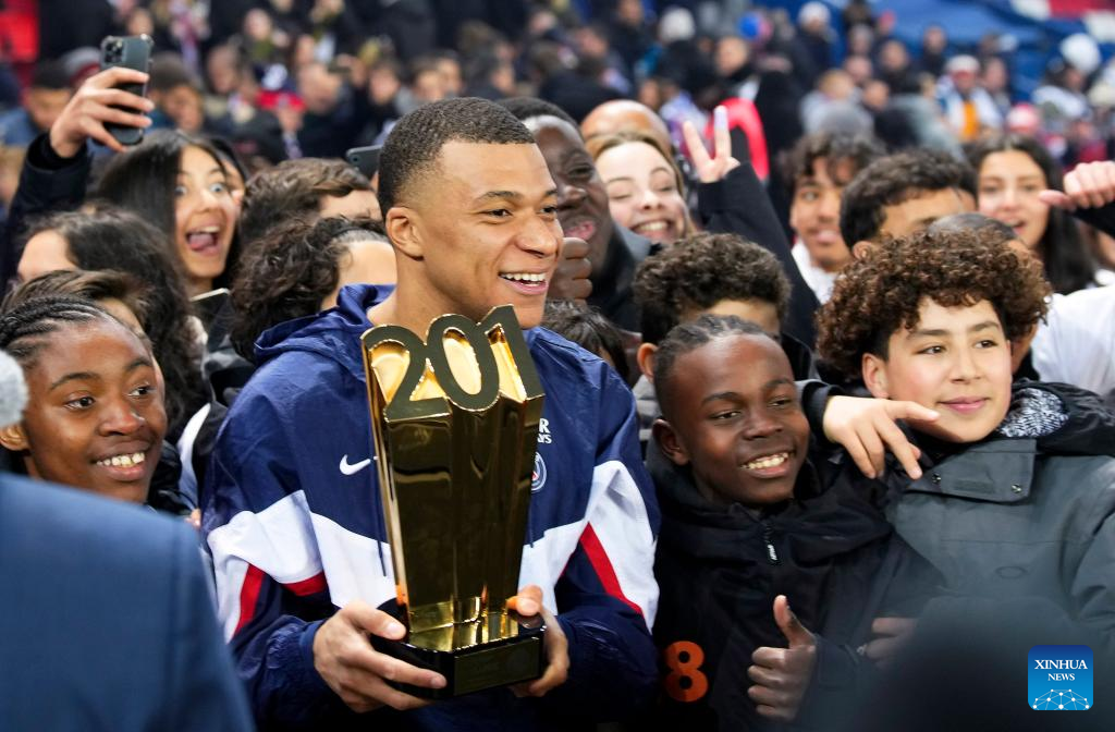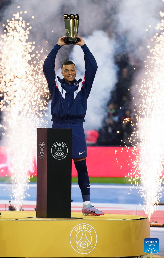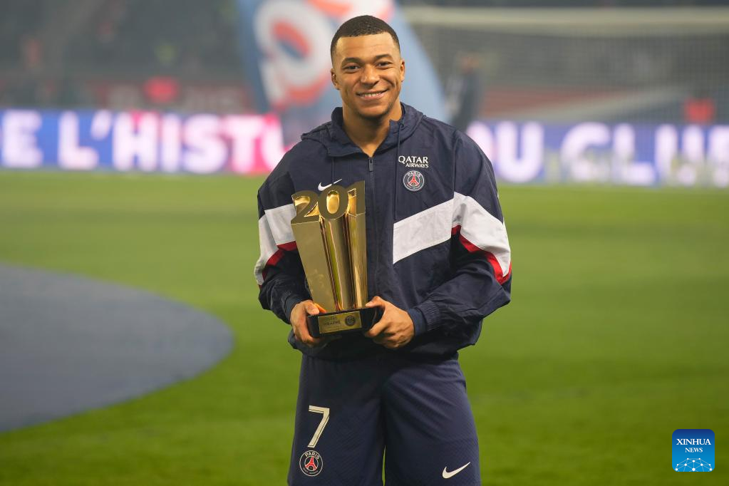 Paris Saint Germain's Kylian Mbappe receives an award for his 201 goals in career with PSG after a French Ligue 1 football match between Paris Saint Germain (PSG) and Nantes FC in Paris, France, March 4, 2023. (Photo by Glenn Gervot/Xinhua)