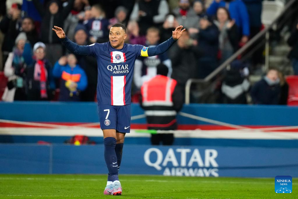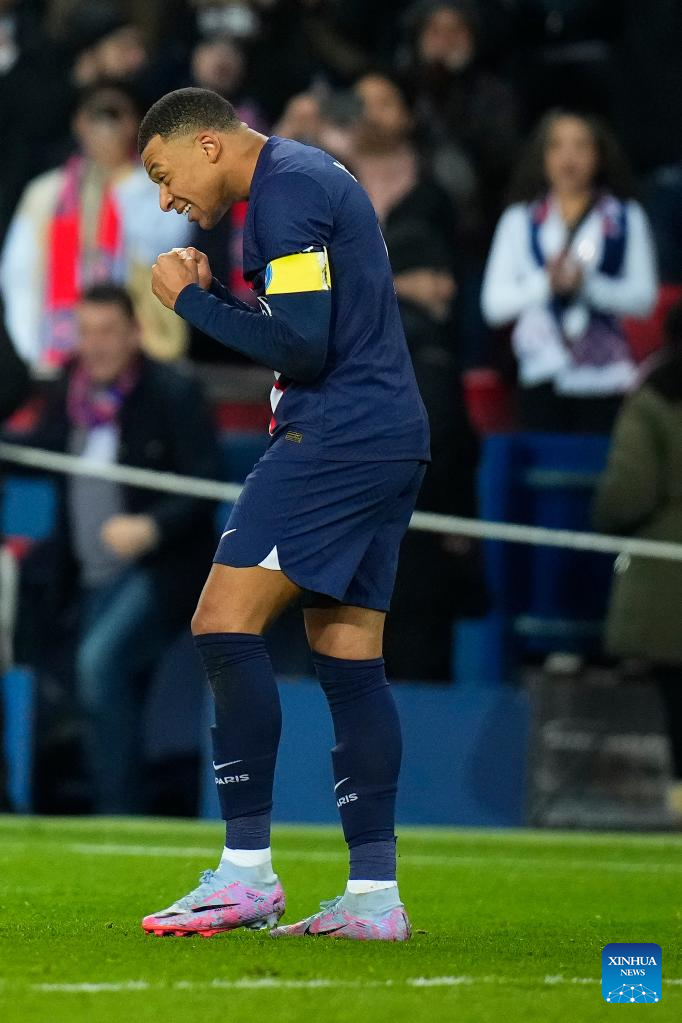 Paris Saint Germain's Kylian Mbappe reacts after his first goal of the match and his 201 goals in career with PSG during a French Ligue 1 football match between Paris Saint Germain (PSG) and Nantes FC in Paris, France, March 4, 2023. (Photo by Glenn Gervot/Xinhua)