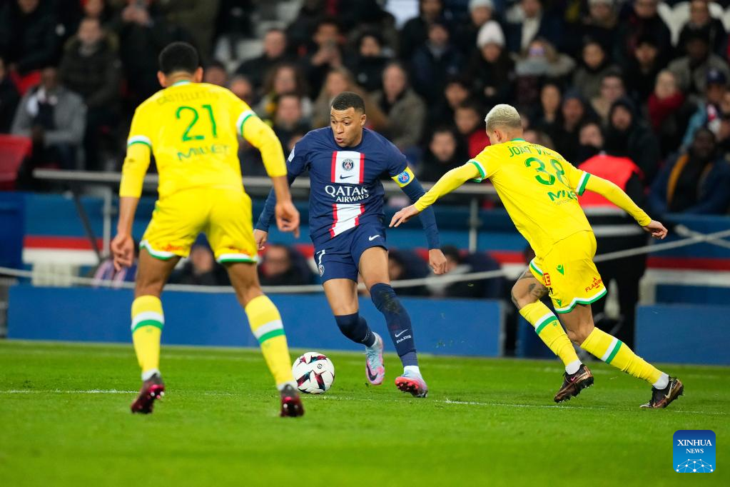 Paris Saint Germain's Kylian Mbappe (C) competes during a French Ligue 1 football match between Paris Saint Germain (PSG) and Nantes FC in Paris, France, March 4, 2023. (Photo by Glenn Gervot/Xinhua)