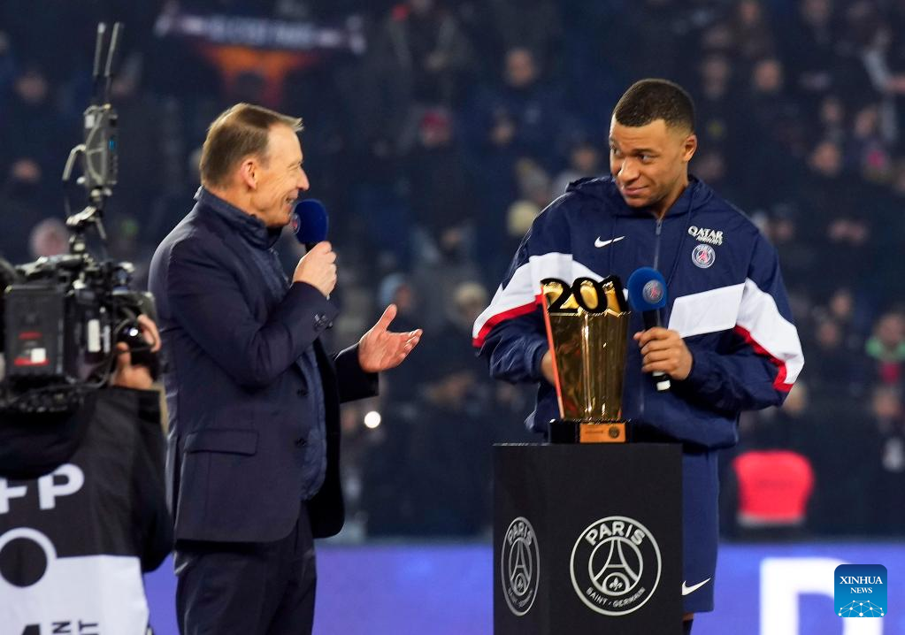 Paris Saint Germain's Kylian Mbappe (C) receives an award for his 201 goals in career with PSG after a French Ligue 1 football match between Paris Saint Germain (PSG) and Nantes FC in Paris, France, March 4, 2023. (Photo by Glenn Gervot/Xinhua)