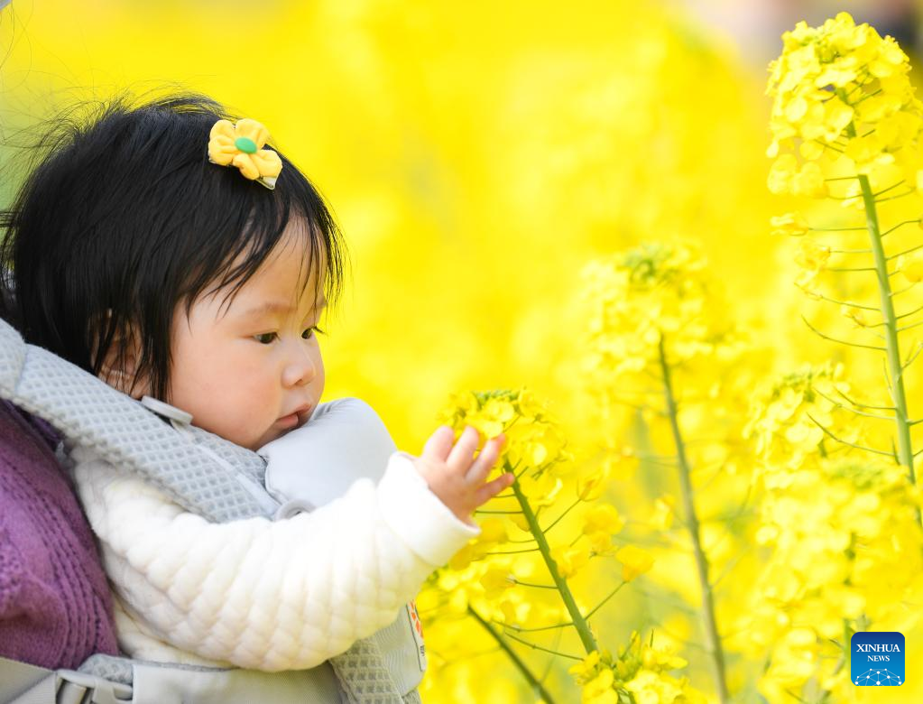 A young tourist looks at flowers in a cole flower field in Daoming Town of Chongzhou, southwest China's Sichuan Province, March 5, 2023. (Xinhua/Wang Xi)