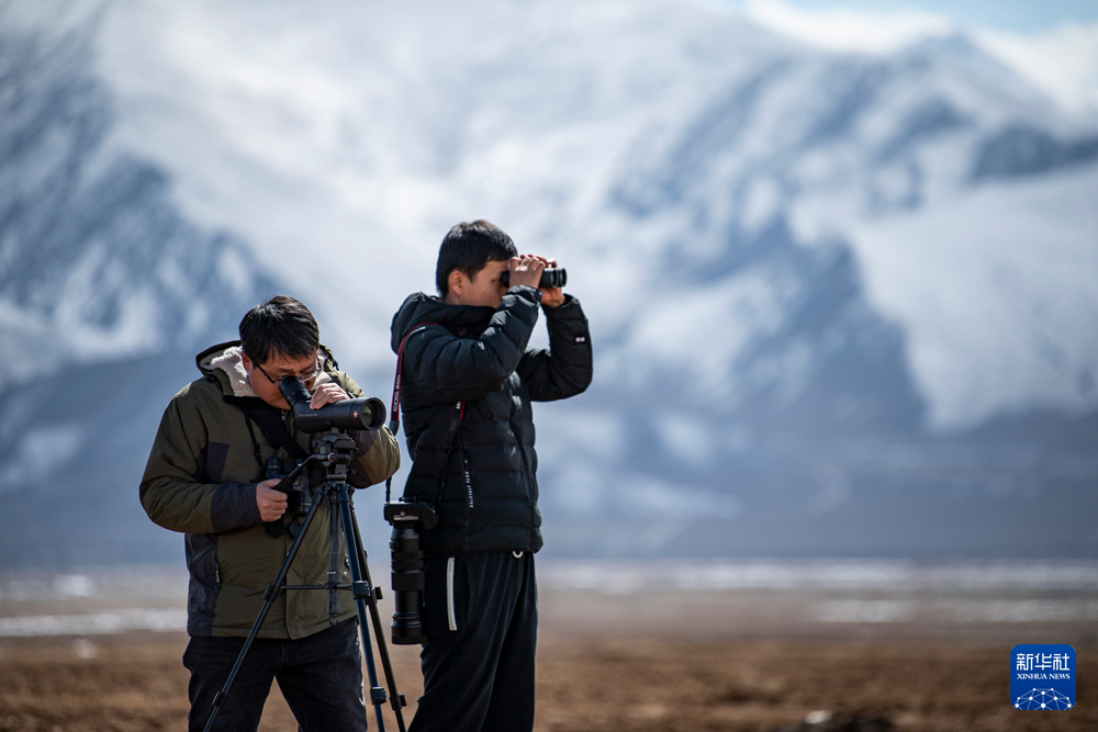 Yang Le (L) observes black-necked cranes with his colleague in Lhunzhub County of Lhasa, southwest China's Tibet Autonomous Region, March 1, 2023. (Xinhua/Sun Fei)