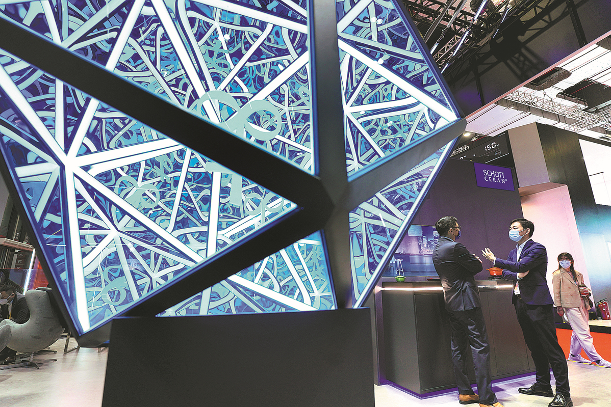 People discuss business by the stand of Schott, a German glass manufacturer, at the CIIE in Shanghai in 2021. TANG KE/FOR CHINA DAILY