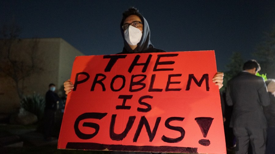 A man holds up a sign denouncing gun violence during a memorial for victims of a mass shooting at Monterey Park City Hall, California, the United States, on Jan. 23, 2023. (Photo by Zeng Hui/Xinhua)