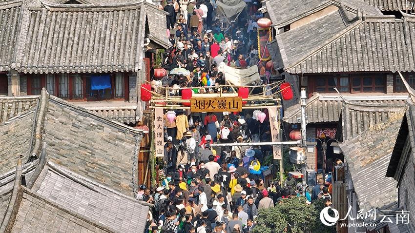 A street is crowded with visitors in Weishan ancient town. (Photo/Dong Mengliang)