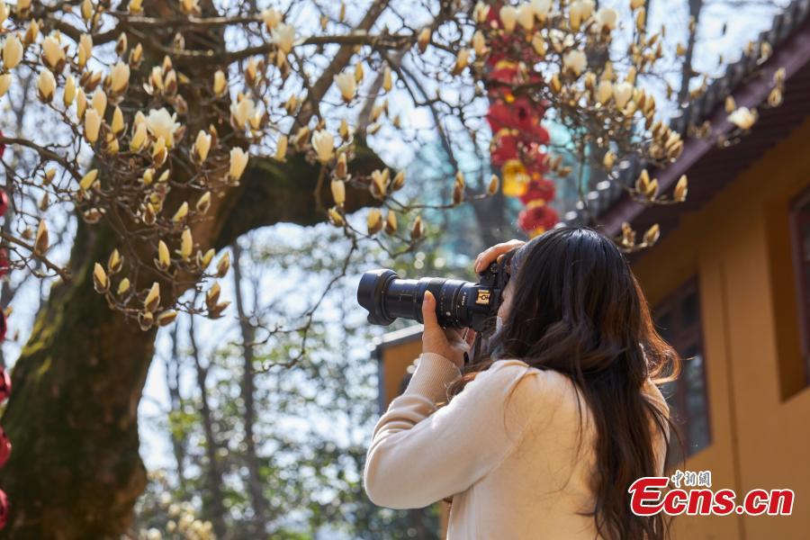 A tourist takes photos of a 500-year-old ancient magnolia tree at Faxi Temple in Hangzhou, east China's Zhejiang Province, March 6, 2023. (Photo: China News Service/Xu Ziqi)