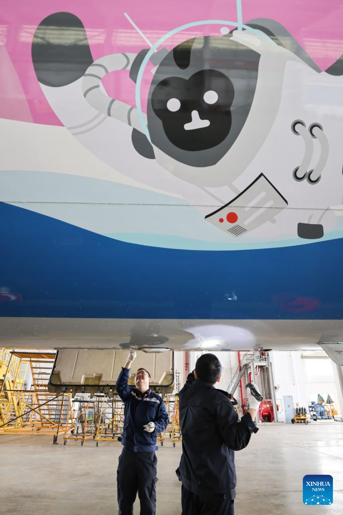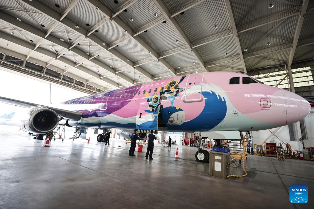 Staff members check a themed plane to prepare for the China International Consumer Products Expo at Meilan International Airport in Haikou, south China's Hainan Province, March 7, 2023. (Xinhua/Zhang Liyun)