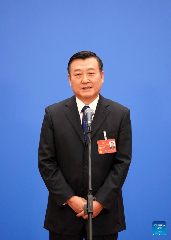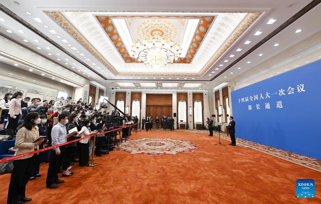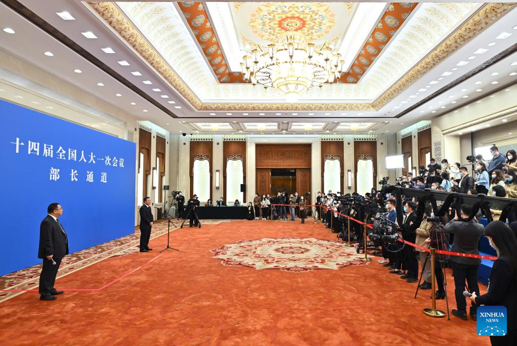 Minister of Housing and Urban-Rural Development Ni Hong gives an interview after the second plenary meeting of the first session of the 14th National People's Congress (NPC) in Beijing, capital of China, March 7, 2023. (Xinhua/Liu Jinhai)