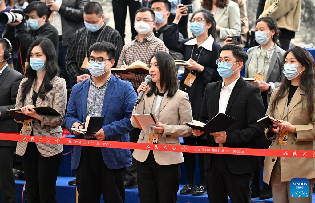 A journalist with Xinhua News Agency asks a question during an interview with ministers after the second plenary meeting of the first session of the 14th National People's Congress (NPC) in Beijing, capital of China, March 7, 2023. (Xinhua/Li Xin)